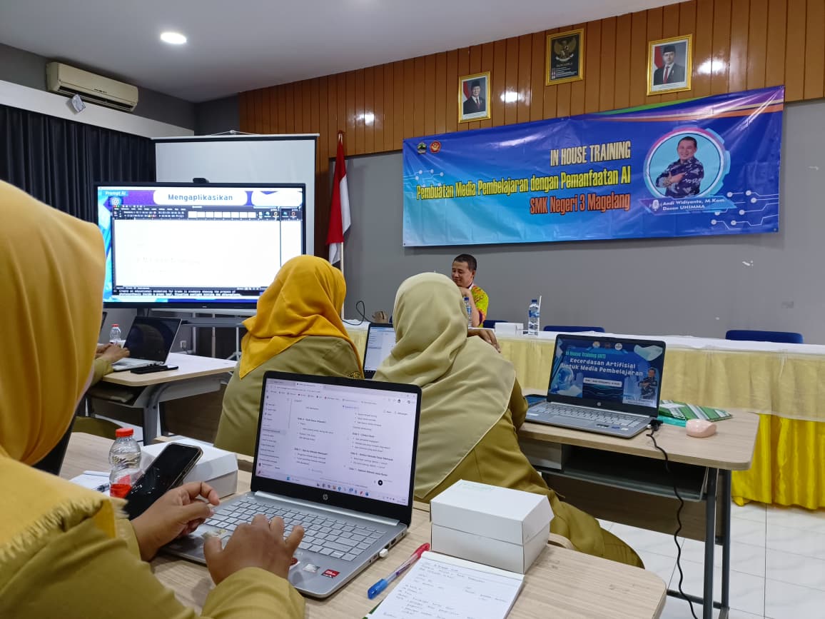 Magelang – SMK Negeri 3 Magelang menggelar In House Training (IHT) bertajuk “Pembuatan Media Pembelajaran dengan Pemanfaatan Artificial Intelligence” pada Senin (8/12) di Ruang Sidang sekolah. Kegiatan ini menjadi salah satu langkah strategis sekolah dalam meningkatkan kemampuan tenaga pendidik menghadapi perkembangan teknologi yang semakin pesat.